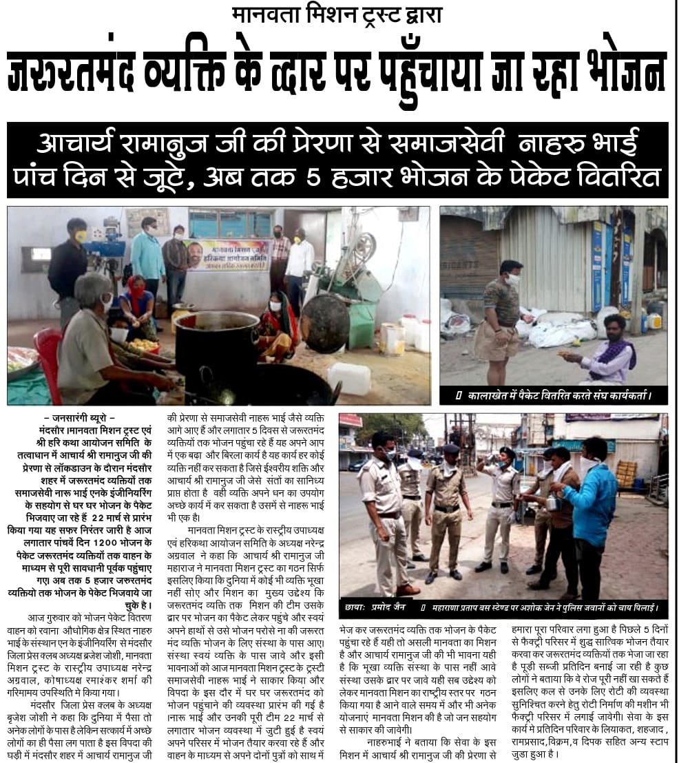 To help the families suffering in the time of this crisis caused by this pandemic of covid-19. Acharya Shri Ramanuj ji through Manavata Mission appealed to help. From 28th March 2020 every day for 3 consecutive months, Manavata mission led by Shri Naharubhai provided free food, water and medicines to about 2500 families. Along with this,food and medicines were distributed to the immigrant laborer’s travelling on Ajmer-Nasirabad road by the young cadres of the mission.